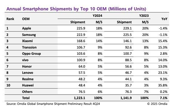 根据市场调研机构Omdia最新发布的智能手机初步出货量报告,欧博2024年第四季度全球出货量达到3.28亿部,同比增长2.8%。2024年全年的总出货量攀升至12.23亿部,与2023年的11.42亿部相比增长了7.1%,标志着该行业正在稳步复苏。