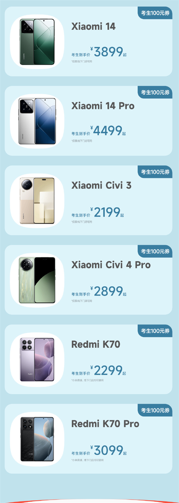 小米14、小米14 Pro、小米Civi 3、小米Civi 4 Pro,每个商品对应一张100元券,仅线下门店可用。