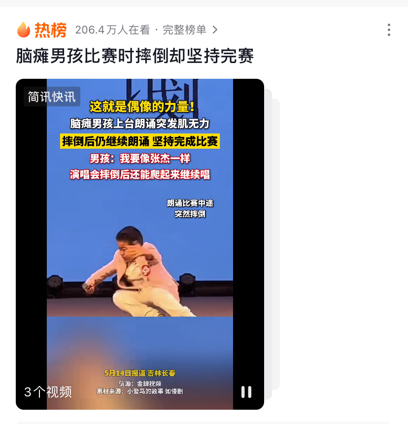 5月15日,欧博allbet一条“脑瘫男孩比赛摔倒,跪倒在地继续朗诵!”的视频冲上了热榜。