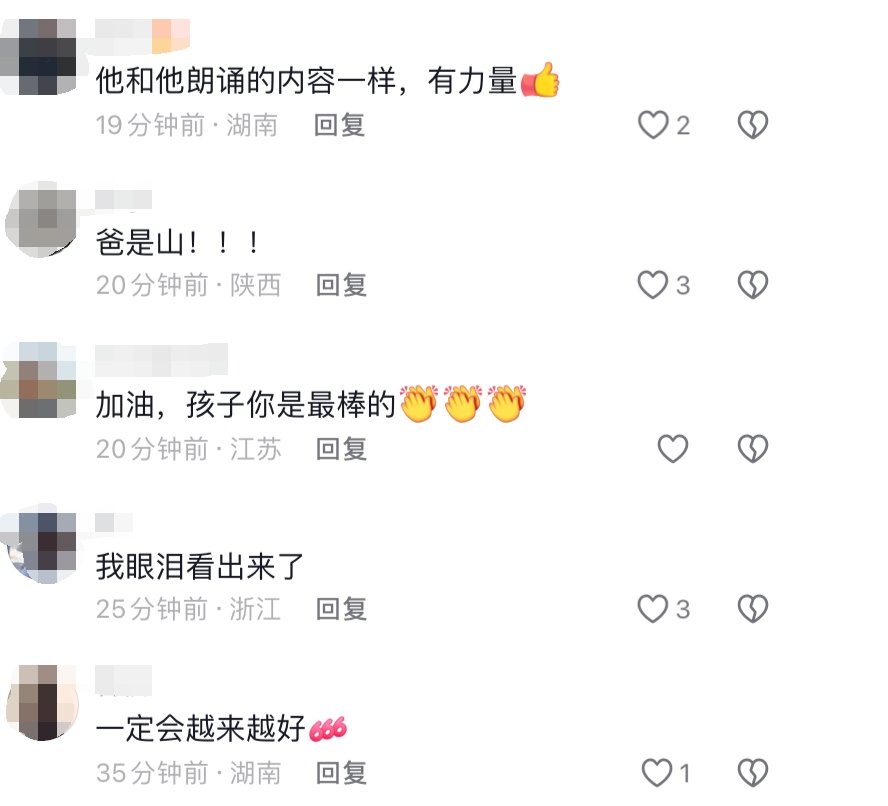 陪读的爸爸回忆起当天的比赛时几度哽咽。看到孩子从摔倒到被扶起,依然坚持着朗诵,从未放弃,直到完成。这个瞬间不仅深深感动了在场的所有人,也包括他和妻子。最终,孩子凭借着这份毅力和表现,获得了比赛的金奖,让他无比欣慰和自豪。